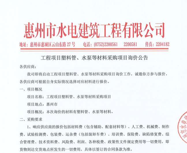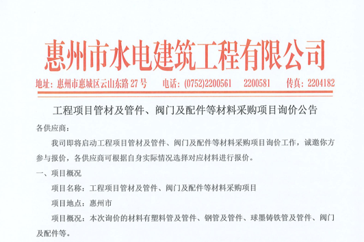 惠州市水電建筑工程有限公司成立于一九六四年四月,隸屬惠州市水務集團有限公司,是一家國有綜合性施工企業,主營水利水電工程、房屋建筑、市政工程等施工業務。公司擁有水利水電工程施工總承包一級、建筑工程施工總承包一級、市政公用工程施工總承包一級、公路工程施工總承包三級,公路路基、路面及建筑裝修裝飾專業承包二級,環保工程、機電安裝、河湖整治、輸變電工程專業承包三級等經營資質……